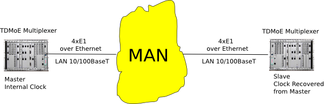 This is implemented with the existing multi service multiplexer FMXM-16 with the new designed control unit with TDMoE (TDMoX) network interface. As it is shown in the above figure one of the multiplexers is set as master and it defines the clocks of the system and the other as slave, i.e. it derives clocks from the arriving packets for clock recovery of the E1 streams.